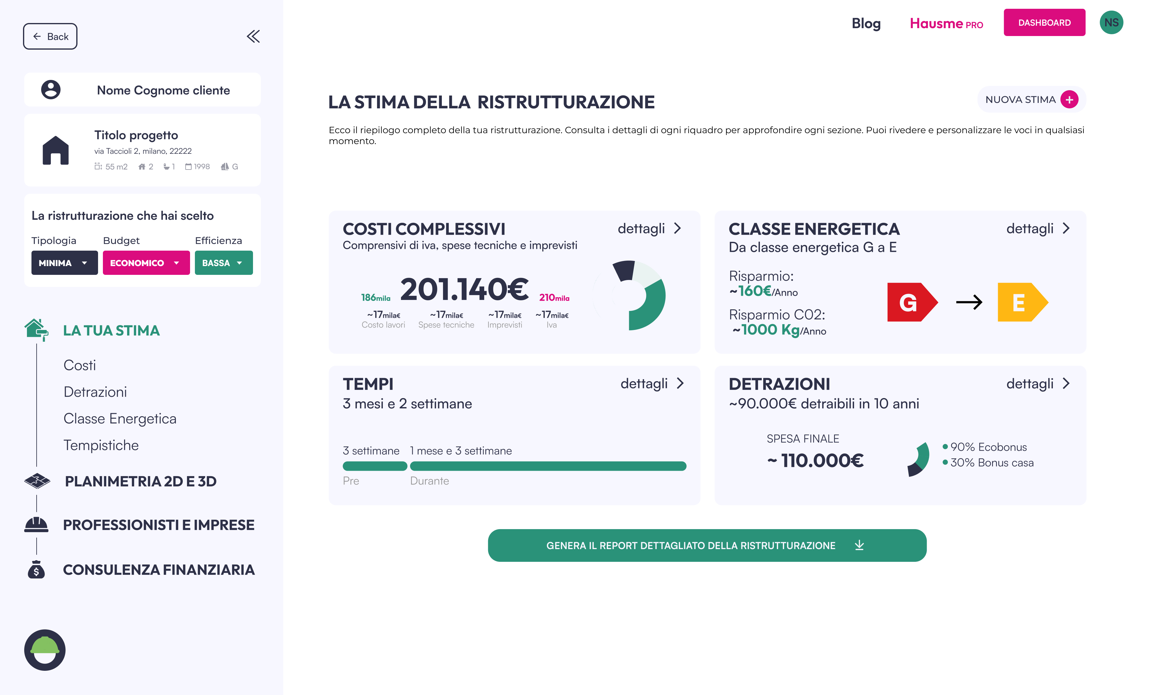 Differenziati dagli altri e offri un servizio impossibile da fare “a mano”. Dai al cliente una proiezione energetica realistica al 99% che mostra l’impatto reale della ristrutturazione su consumi, classe, comfort e costi di gestione dell’immobile.